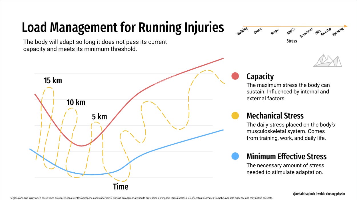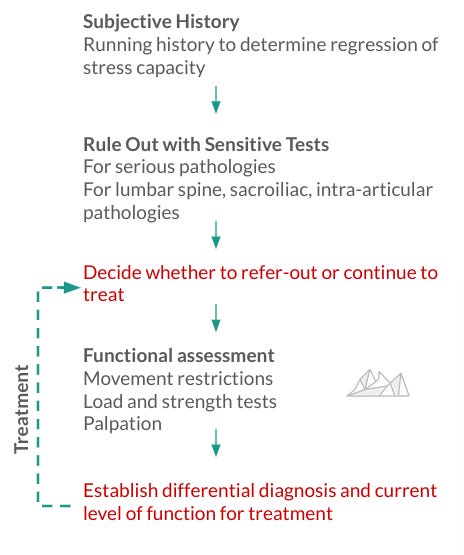 Within the runner’s subjective history, she already describes a diminishing capacity over the last several months prior to her initial visit. She also included which running workouts generated pain (hills, and speedwork). This should clue the clinician to figuring out what sort of maladaptive (overloading and underloading) stress she has been applying to her body. It should also help with the correct prescription of run/walk programs and exercise programs to improve the runner’s stress capacity and resilience. Now there may be many reasons for a decreasing capacity including some red flags and concerning pathologies we need to rule out. But make note of this first before your physical assessment and you can circle back to it for education and treatment.