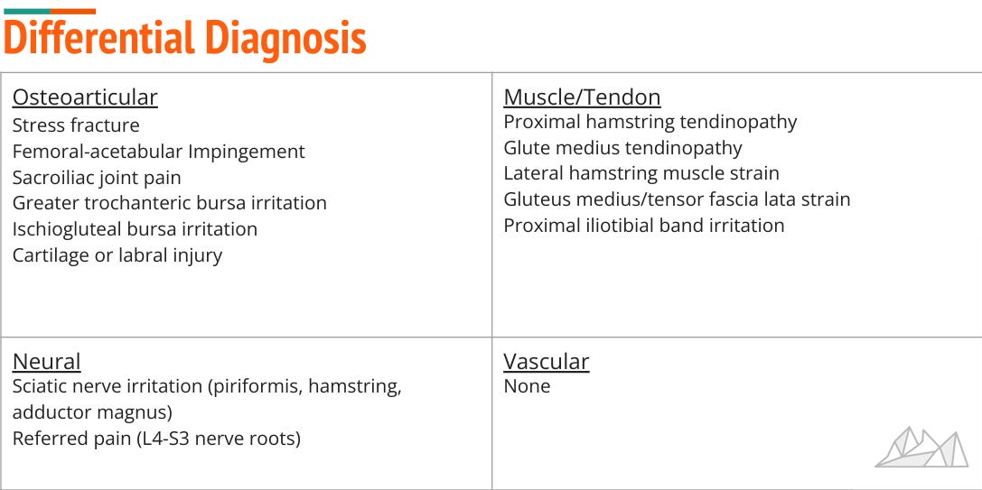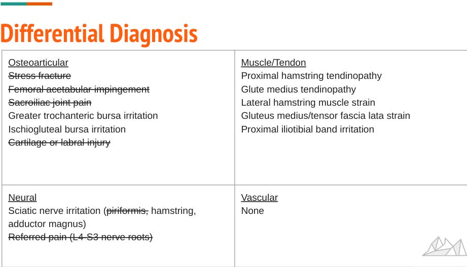 You can see how our runner initially had a myriad of possible diagnoses (13, if not more). With our algorithm we have eliminated close to 50%. The bursa, muscle and tendon diagnoses should not be too difficult for an experienced physiotherapist to identify using a combination of load/strength testing and palpation. If there is concern of misdiagnosis within these 7 structures, ask yourself this question “Does my management significantly change if it is a glute medius tendinopathy versus hamstring tendinopathy?” Given that there should be reassessment and follow-up treatment sessions there is always time to fine-tune which exercises and treatment techniques to use but more serious pathologies that require referral should always be ruled out first.