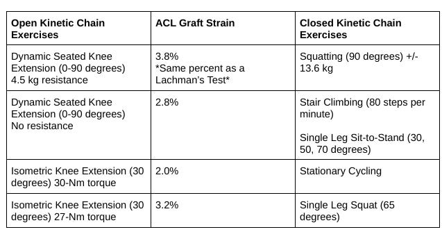 The 2023 Aspeter ACL Guidelines finds no contraindication for the initiation of OKC exercises (90-45 degrees) after 4 weeks. Below is a comparison of OKC and CKC exercises and the amount of graft strain performed.