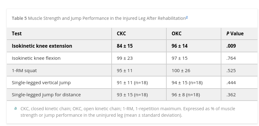 Jewiss, D., Ostman, C., & Smart, N. (2017). Open versus closed kinetic chain exercises following an anterior cruciate ligament reconstruction: a systematic review and meta-analysis. Journal of Sports Medicine, 2017.