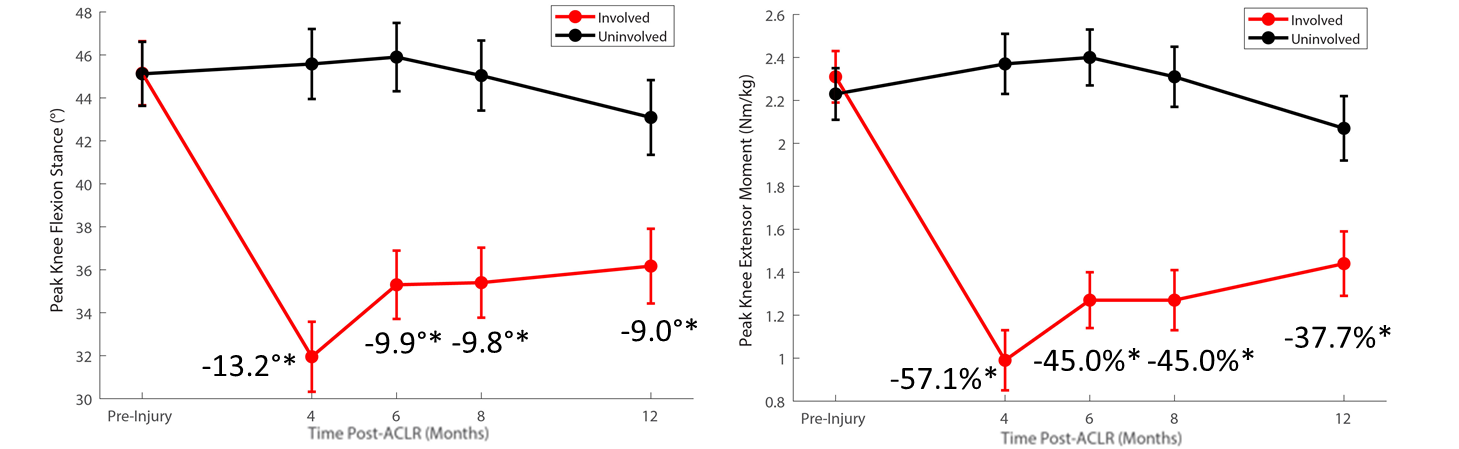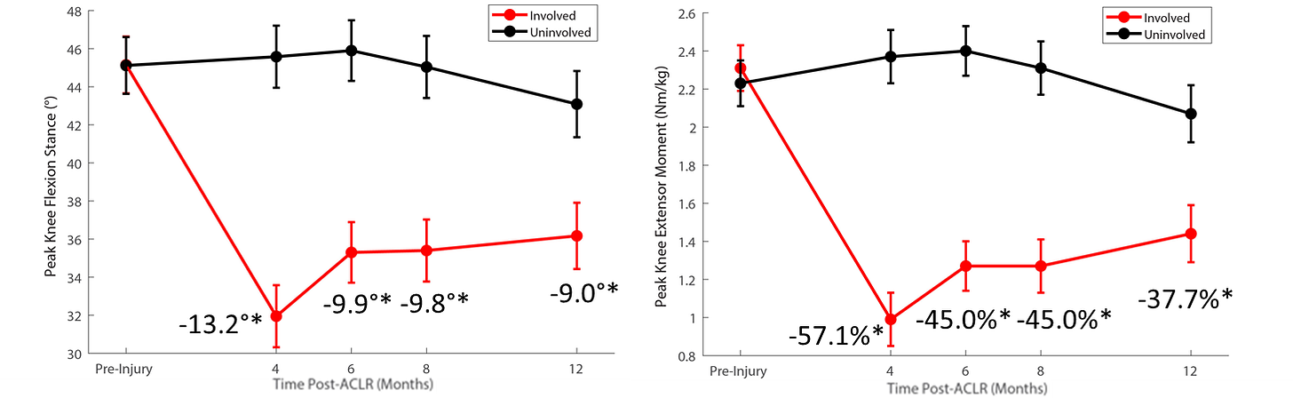 It appears that biomechanical alterations in running can persist even five years after surgery. In the graph below from Knurr 2019, one can see how at 12 months post ACLR there is 37.7% difference between knee extensor strength. A 2019 systematic review reports suggests that the lack of instantaneous knee extensor strength and power changes the loading and contact pattern of the knee, perhaps this explains the overall underloading of the knee in running and persistent pain over time.